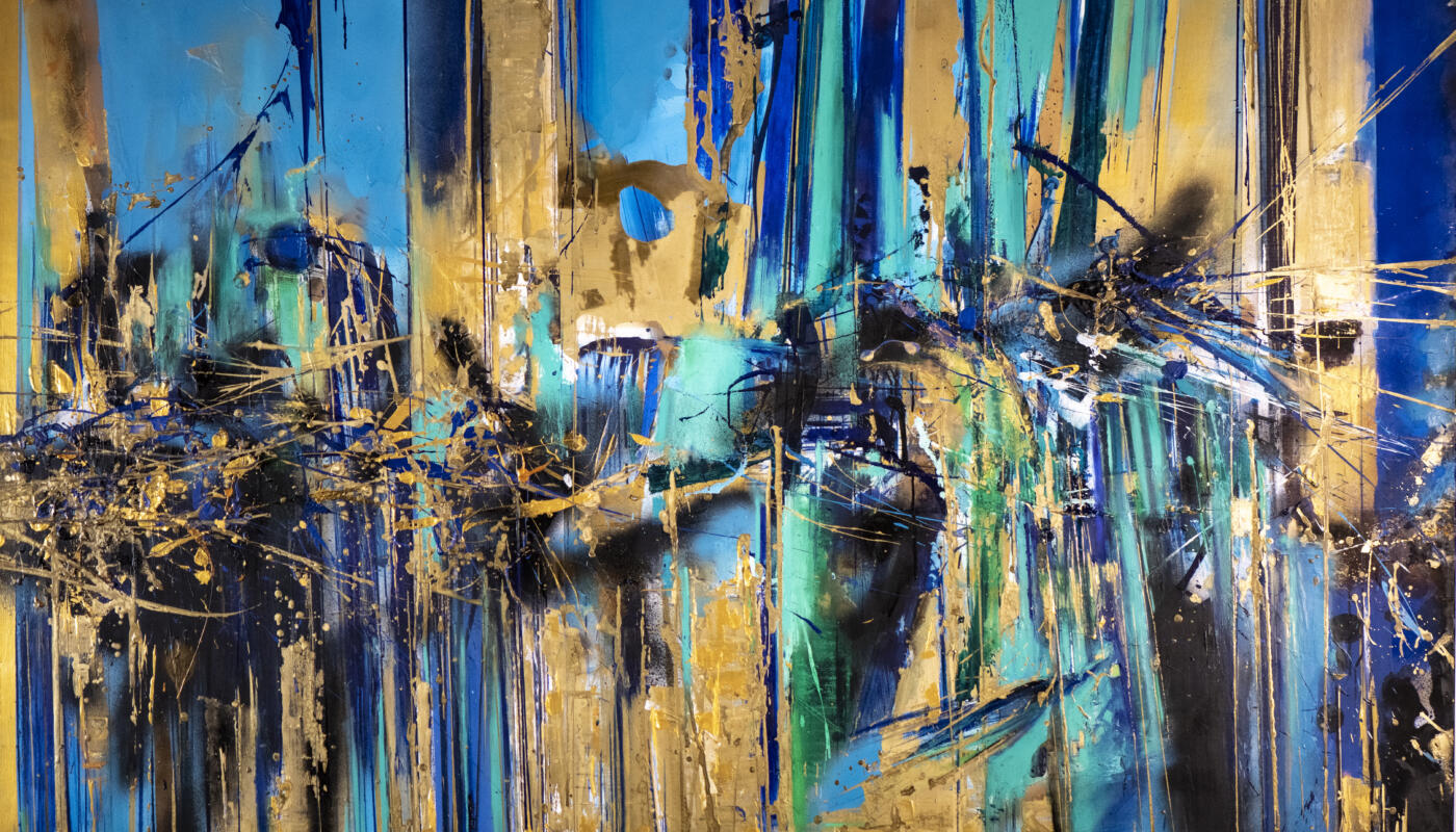 In particolare, nelle opere esposte in mostra - sedici oli e smalti su tela tratti dalla serie Drops from the Gods - la sontuosa presenza dell’oro, spesso posto in rapporto di articolata combinazione con i toni del blu, è un chiaro riferimento alla gamma cromatica che la pittura occidentale ha da tempi remoti adottato per rappresentare il divino. Dagli sfolgoranti mosaici bizantini ai fondi oro della pittura prerinascimentale, arrivando sino alle composizioni di Klimt, la presenza dell’oro, soprattutto se coniugata con il blu, conduce il visitatore in una dimensione oltreumana intrisa di sacralità.